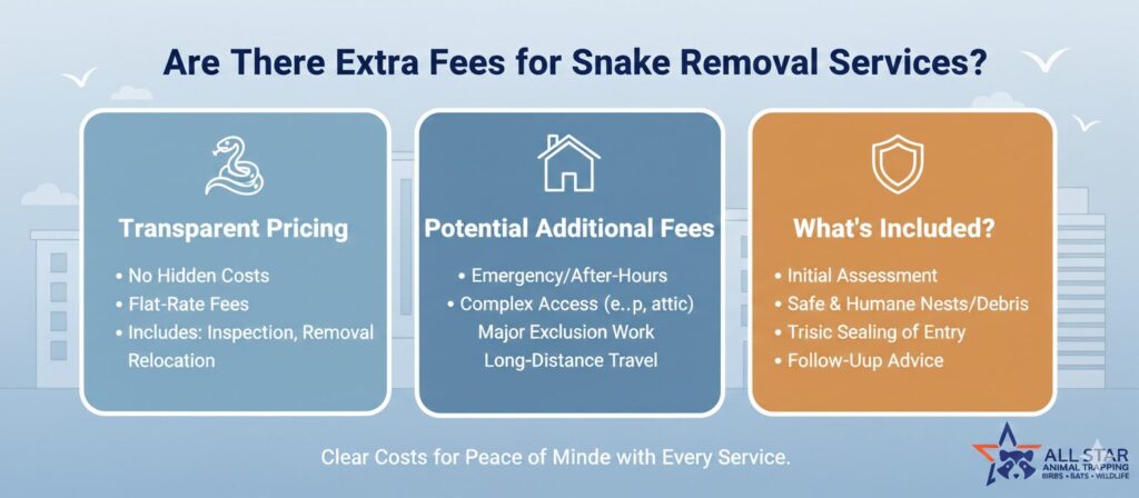 What answers the question “Are there extra fees for snake removal services?” is understanding the service scope and conditions. Basic removal is often included, but emergencies, venomous species, difficult access, and prevention services may cost extra. Transparency is the key factor when choosing a provider.