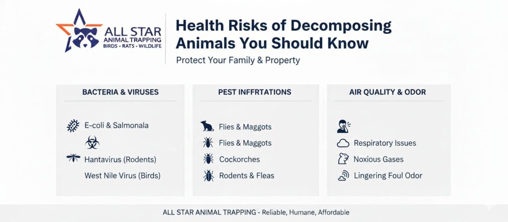 Decomposing animals are a direct source of biological hazards that threaten human health. Exposure can occur through air, surfaces, or direct contact, making the situation dangerous even without touching the remains. These risks are especially severe in enclosed indoor environments.