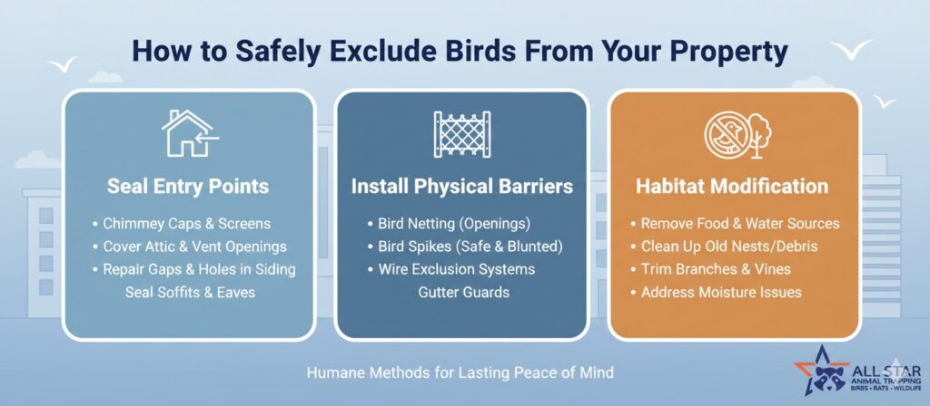 The first step in learning how to safely exclude birds from your property is to identify and secure entry points. Birds can squeeze through tiny gaps and enter attics, vents, and chimneys.