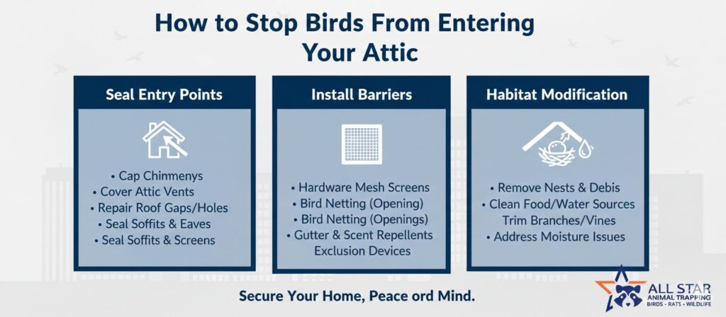 Long-term success depends on consistency and layered prevention. Birds may attempt to return if conditions become favorable again. Staying proactive is essential to stop birds from entering your attic permanently.
