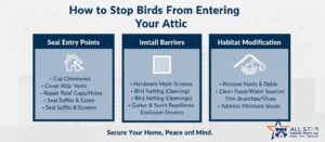 Sealing cracks, holes, and loose panels removes potential entry points. This step is critical to stop birds from entering your attic.