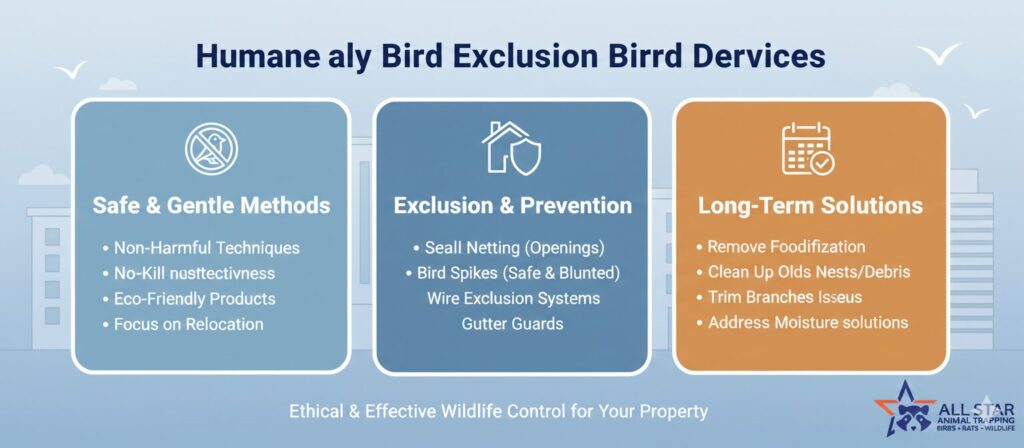 Professional Humane Bird Exclusion Services plans interventions seasonally to maximize effectiveness. Adjustments in deterrents and maintenance schedules ensure that properties remain protected year-round.