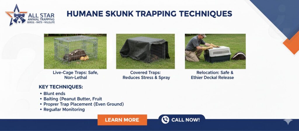 Humane skunk trapping techniques focus on safely capturing skunks without causing pain, injury, or unnecessary stress. These techniques are designed to protect homeowners while respecting wildlife and maintaining ecological balance. Using humane skunk trapping techniques also helps prevent unpleasant encounters, property damage, and health risks.