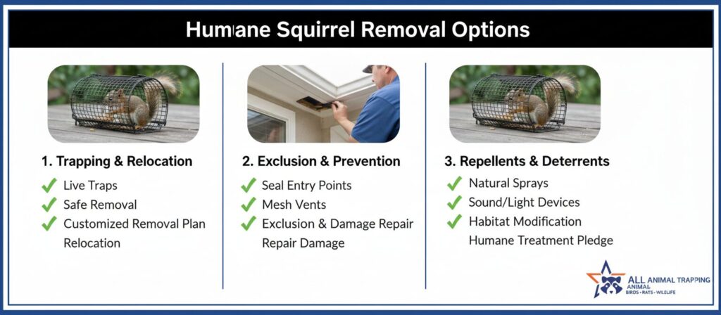 Squirrels are captured using live traps and handled ethically. Relocation follows humane guidelines. This minimizes stress and harm.