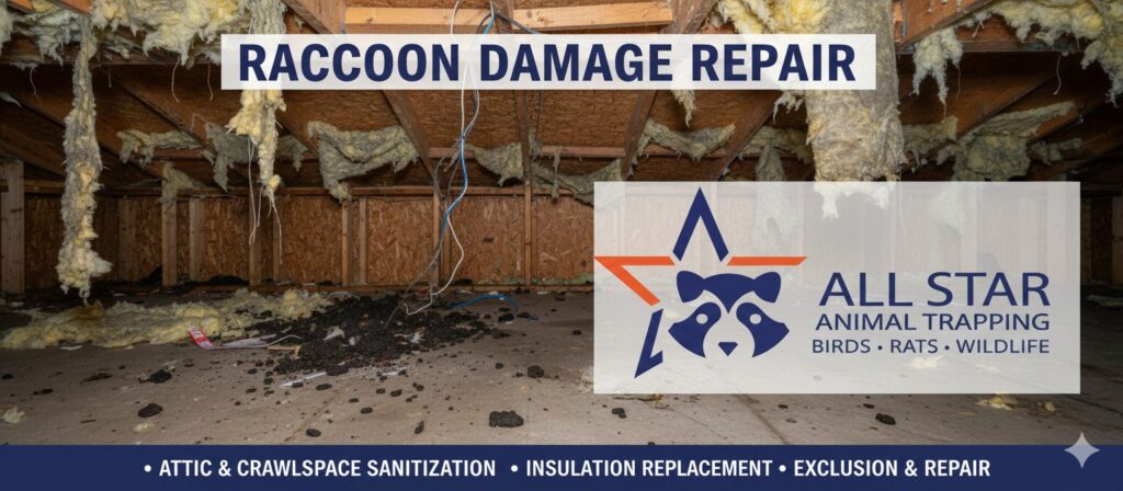 Raccoon damage repair restores areas damaged by raccoons. It includes cleanup, repairs, and sanitation. Raccoon waste creates health risks. Structural damage can worsen quickly. Professional repair prevents further issues. It keeps homes safe and livable.