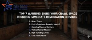 Crawl spaces are often overlooked, yet they play a crucial role in your home’s safety and efficiency. Ignoring the top 7 warning signs your crawl space requires immediate remediation services can lead to serious crawl space problems, including crawl space moisture issues, crawl space mold removal, and even crawl space structural issues. Excess humidity, standing water, or pest infestations can compromise insulation, damage wood, and increase energy bills.