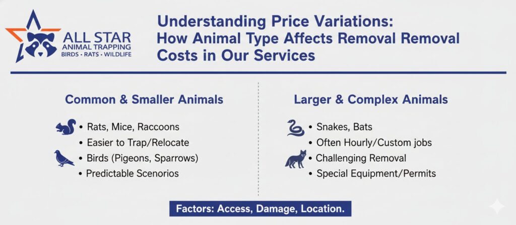 Animal type impacts pricing through size, biohazards, equipment, and cleanup needs. Small rodents lowest; large wildlife highest. Quotes adjust for species-specific challenges.
